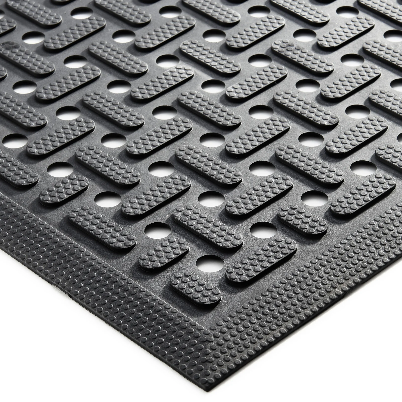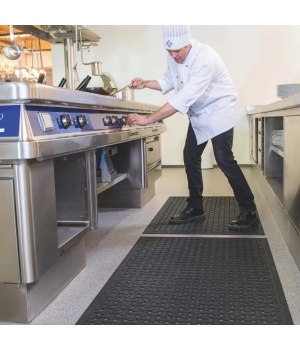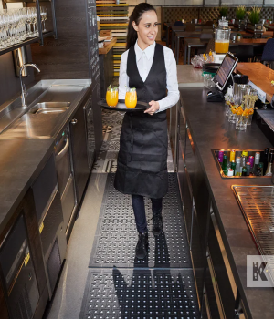 Гумовий килимок Thru Plus має пружну конструкцію з нітрильної гуми, яка зменшує втому від тривалої роботи на кухні чи за барною стійкою. Текстурована поверхня забезпечує надійну опору, а спеціально розташовані отвори сприяють дренажу та чистоті.